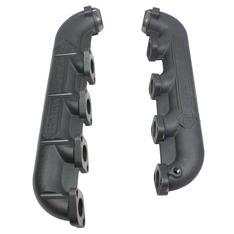 Heavy walled manifolds for improved durability. Manifolds are coated to resist corrosion and are pre-drilled for pyrometer probes. These units replace the old rusted and leaking stock exhaust manifolds that normally require extensive cleaning and machine work to be recovered from warping and distortion. The manifold set comes with both passenger & driver's side units and feed pipe mounting hardware. With the stock manifolds considered a maintenance item due to corrosion and leaking, this set is an excellent preventative replacement item whenever doing other engine work.