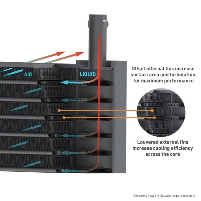 82% greater core volume, 112% increase in fin area, and 1.34-quart fluid capacity for improved cooling capacity.
